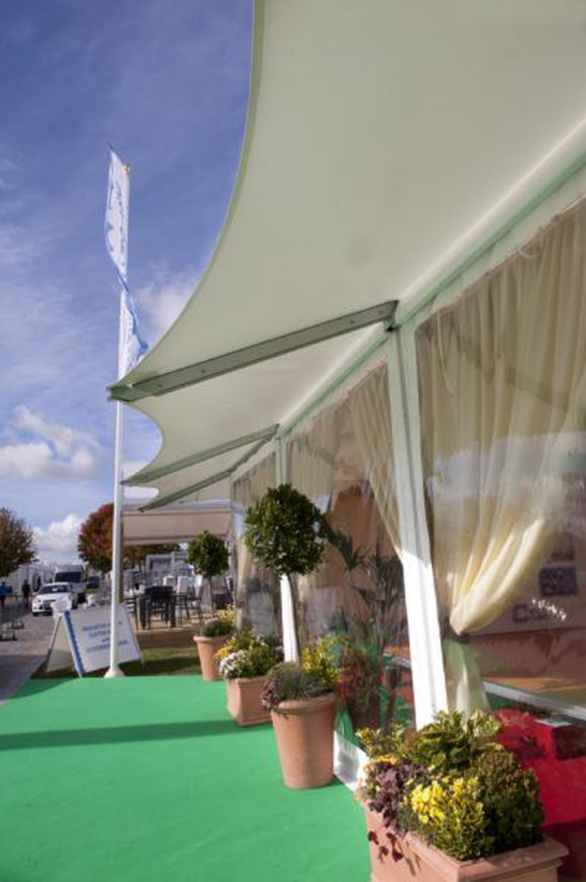 The Custom Covers' Hayling frame utilises many existing components from a standard marquee to give a significantly different look and feel to the structure. Deep scalloped roofs with a 1.5m overhang and a gently sloping hip end make this a visually attractive alternative to the standard eave detail.