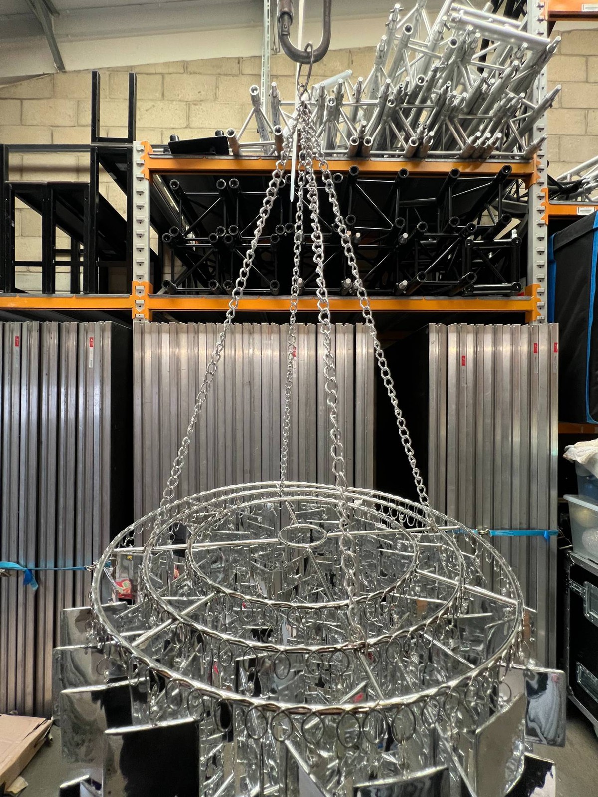 Previously used on a handful of high-end events, these chandeliers are in good condition with some light surface marks on a few mirrored tiles.