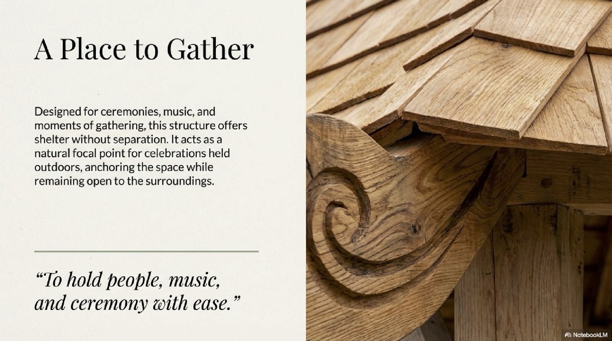 Designed for ceremonies, music, and moments of gathering, this structure offers shelter without separation. It acts as a natural focal point for celebrations held