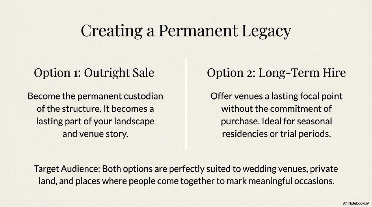 Become the permanent custodian of the structure. It becomes a lasting part of your landscape and venue story.