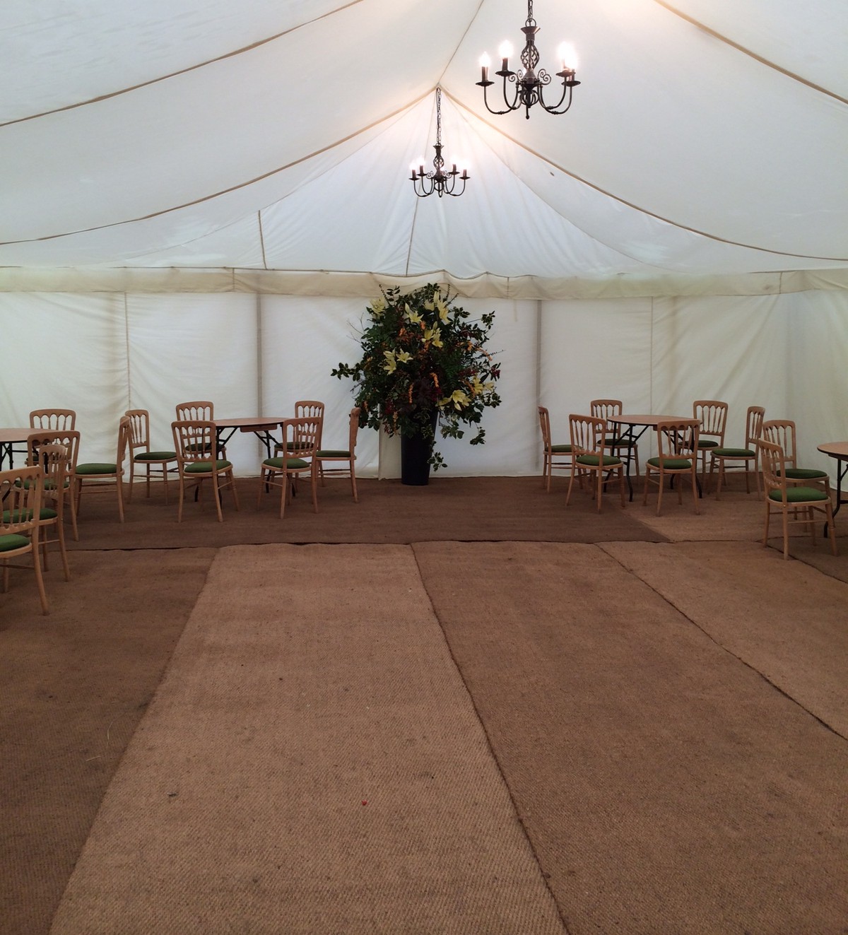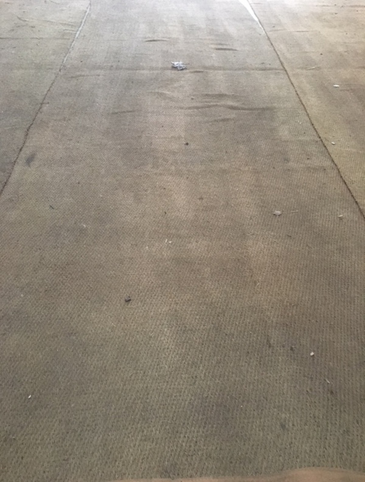 Ex-hire natural coloured coconut matting with ends bound using ginger coloured binding.In pieces 20' x 6' (6.1m x 1.83m) wide.