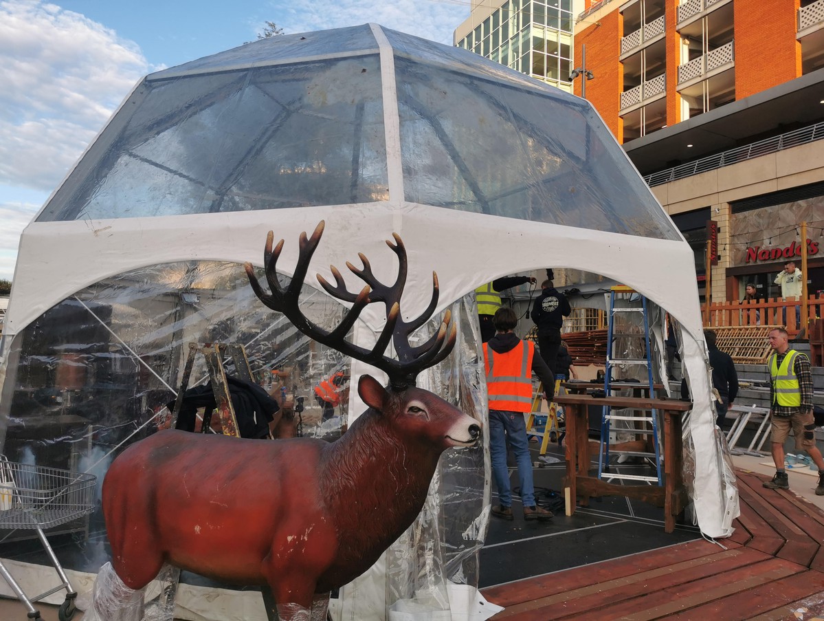 The tent can be bought only as a tent for £6500 or with the bar installation inside which has four bar counter-trolleys build purposely to fit in this igloo and the led sign.