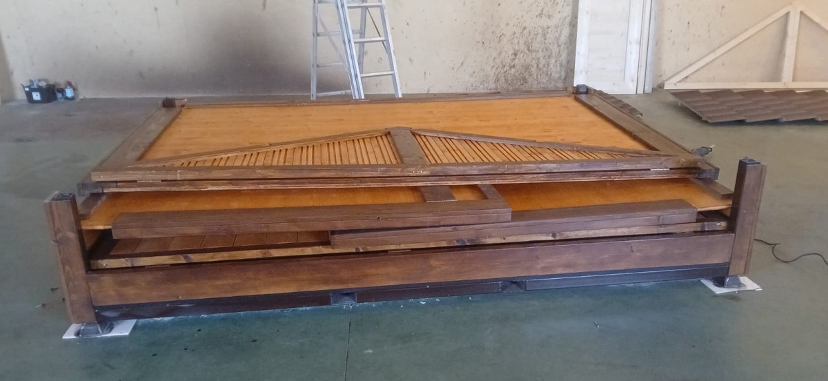 Built from solid wooden panels (no ply), all foldable, with a strong metal frame and integrated forklift pockets.