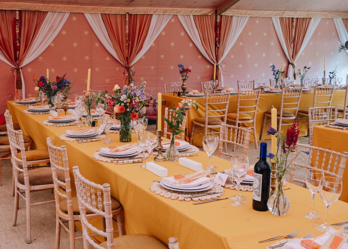 Perfect for an English summer wedding, this beautifully crafted Indian marquee in peach pink with delicate star motifs brings elegance and atmosphere to any outdoor celebration.The rectangular tent measures 10m x 16m, offering 160 m² of coverage—ideal for 120 seated guests in a trestle table setup. Alternatively, round tables can be used to accommodate dining, dancing, and the ceremony itself under one roof.